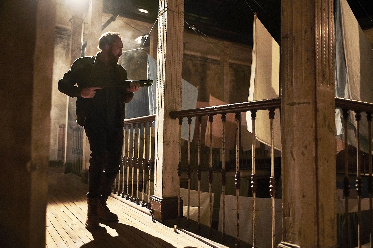 今回ニコケイが演じるのは中南米のどこかで、さびれたホテルを経営しているアラニャという男。“アラニャ”はスペイン語で“蜘蛛の巣”という意味らしく、お話に全く関係ないわけではないのだが、特に覚えておく必要はないのでスルーしよう。『マンディ 地獄のロード・ウォリアー』(2017年)から引き続きもっさりヒゲモジャなルックスのニコケイは、地顔でも何を考えているのかよくわからないのに、いよいよ顔を見ているだけで不安になるレベルに達しつつある。