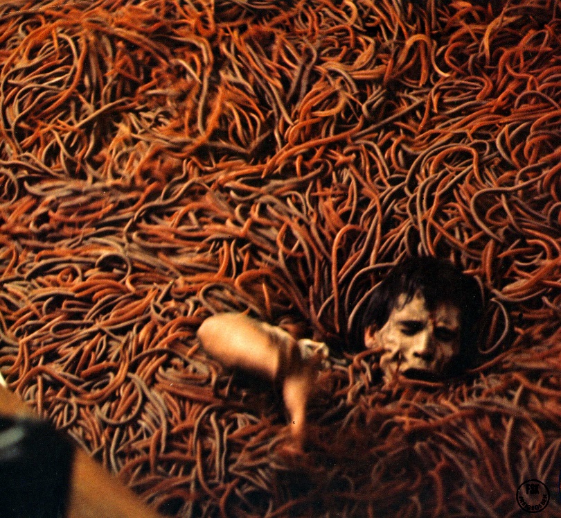 劇中の「このあたりのゴカイは少し変わっていて、人間を噛む」という説明的な前フリどおり、土中だけでなく蛇口などからも続々とわき出てくる無数のゴカイに襲われることになる。後に『狼男アメリカン』(1981年)で第54回アカデミー賞メイクアップ賞を受賞し、マイケル・ジャクソン「スリラー」のミュージックビデオでも知られるリック・ベイカーによる、スプラッタ系ホラーよりもピンポイントで生理的嫌悪感を誘う秀逸な特殊メイクは一見の価値あり。