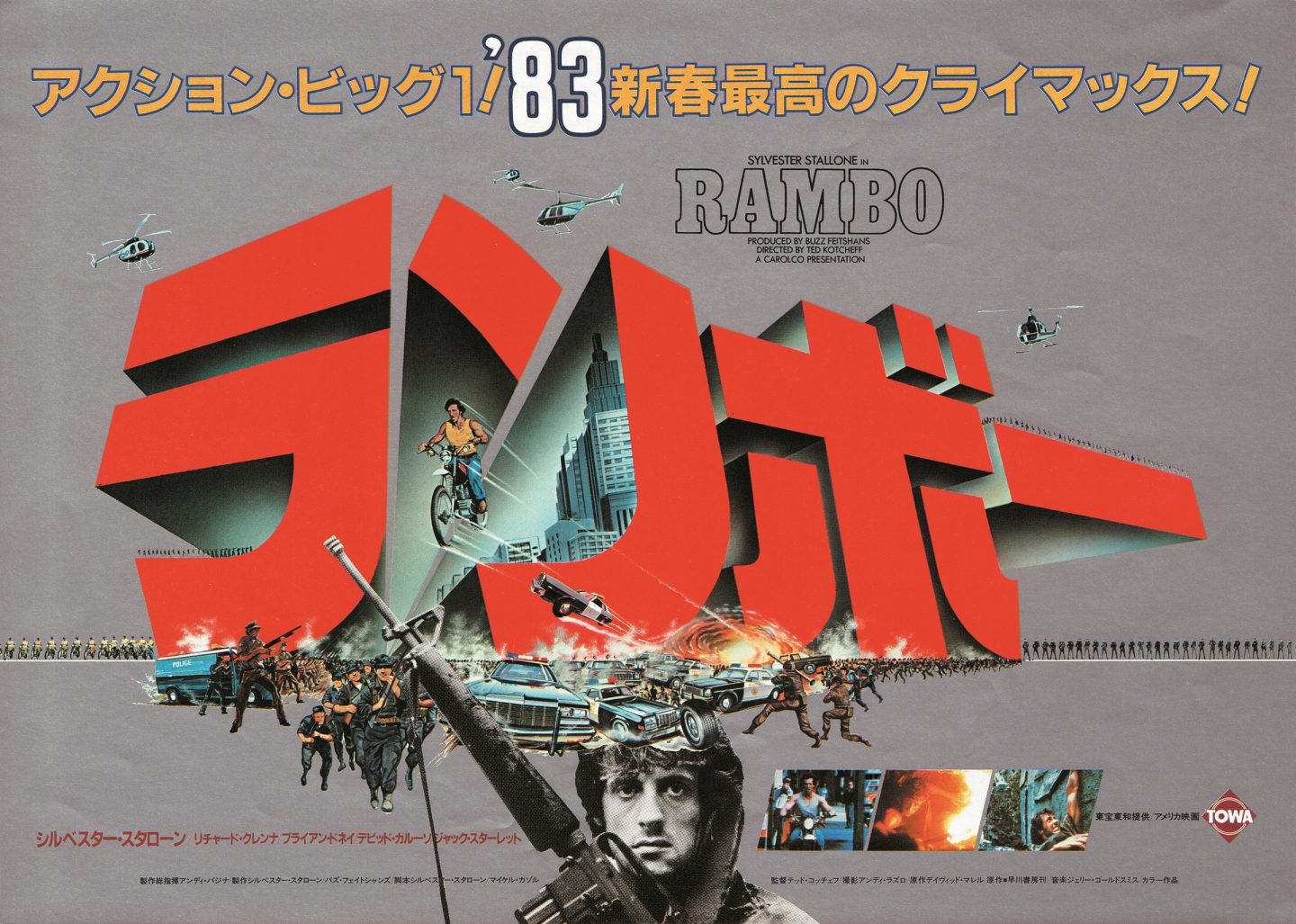 原題『ファースト・ブラッド』を完全無視、主人公の名前を日本題名として冠してしまったシルヴェスター・スタローンのアクション作『ランボー』(1982年)も、檜垣デザインで運命を変えられた映画だ。製作側もびっくりの大ヒットを日本で記録し、続編以降はオリジナル・タイトルそのものを「ランボー」に変えさせてしまったことで有名だが、その影響力の一端に、檜垣がでっち上げ……失礼、作り上げた巨大すぎるタイトルロゴ・デザインのパワーがあったことは間違いない。
