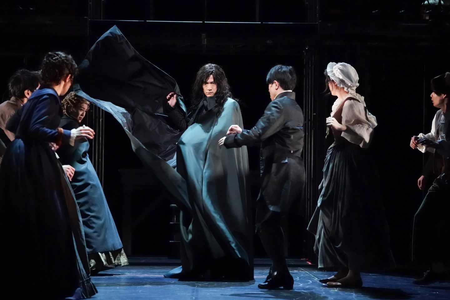 初日前日の公開ゲネプロ(本番と全く同様に行う最終リハーサル)を観たが、冒頭、稲垣が群衆の中からマント姿で現れた瞬間から、観る者は18世紀の血生ぐさいパリへと誘われる。見事な導入だ。いくつもの矛盾に葛藤しながらも、裁きの代行者としての冷静さ、気高さ、そして人間としての純粋な痛みを、稲垣は繊細に表現する。激情型のベートーヴェンが赤だとしたら、サンソンの稲垣はまるで青のグラデーションを見るようだ。空色からロイヤルブルー、そして紺碧まで、どんどん深まっていく。ルイ16世役の中村橋之助も、浮世離れしつつ慈悲深い国王がはまり役だ。
