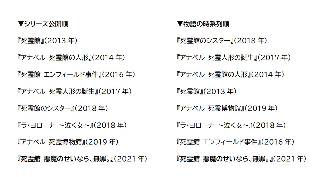 死霊館ユニバースは2013年にジェームズ・ワン監督が発表した『死霊館』を起点としています。“ユニバース”という言葉が示すように、1つの世界観の中で様々な怪奇事件が起こるわけです。公開順/お話の流れの時系列は以下の画像のとおり。