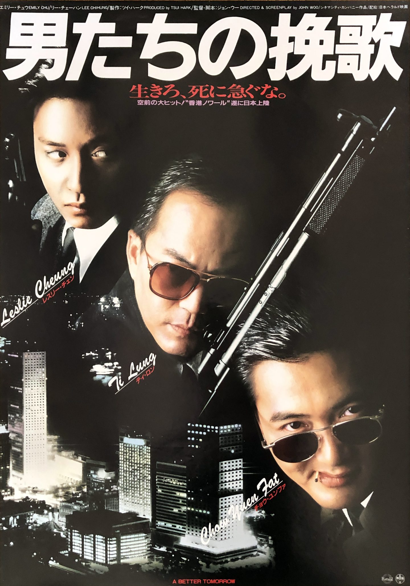 『男たちの挽歌』は、1986年夏に香港・台湾で公開されて空前の大ヒットを記録、翌年ベルリン映画祭で上映されたのに続いて、4月に日本で公開された。海外市場でいちはやく反応したのは、ほかならぬ日本だったのだ。黒バックに主役の3人をクールに配置したビジュアルは、それまでのベタなギャグやマンガチックなアクション中心の香港映画のイメージとは一線を画していた。渋谷の東急文化会館の壁面に巨大な看板が掲げられていたのを今でも覚えている。松竹・東急系で拡大ロードショーされたのだ。