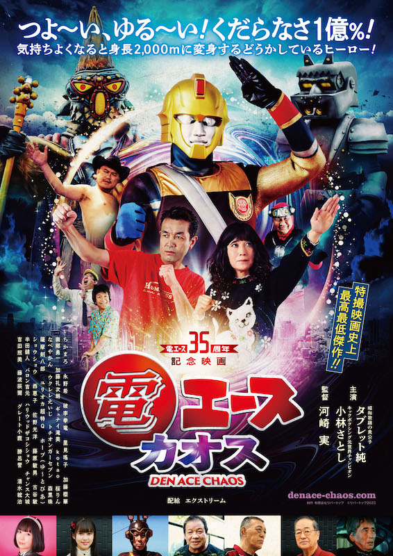 『いかレスラー』『日本以外全部沈没』『地球防衛未亡人』など日本バカ映画の巨匠・河崎実監督の代表作こそ実は“電エース”。完全にどうかしている、常識を超えた特撮ヒーロー映画の決定版『電エースカオス』が、12月22日(金)より公開される。このたび、ポスタービジュアルと予告編が解禁となった。