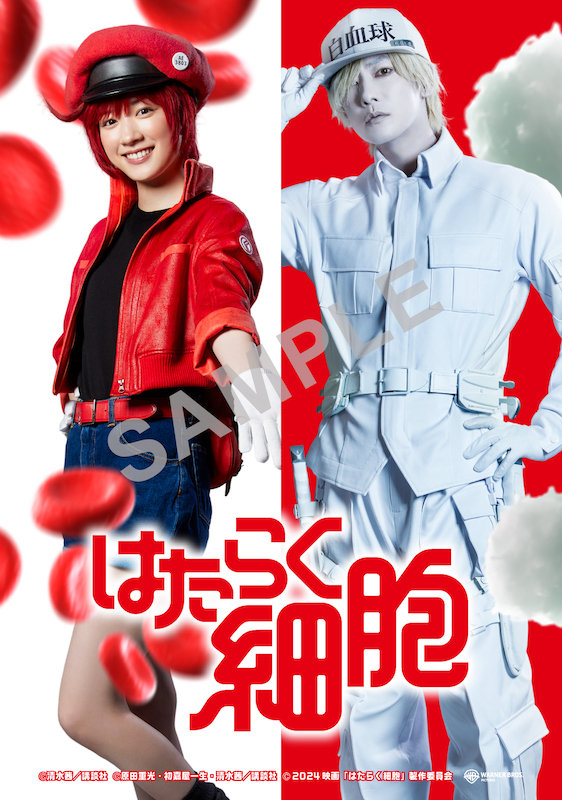 永野芽郁=赤血球、佐藤健=白血球(好中球)のW主演に加え、人間の親子役で芦田愛菜、阿部サダヲ。身体の中で“はたらく”細胞役に、山本耕史=キラーT細胞、仲里依紗=NK細胞、松本若菜=マクロファージ、染谷将太=ヘルパーT細胞、深田恭子=肝細胞、板垣李光人=新米赤血球、加藤諒=先輩赤血球、マイカピュ=血小板。漆崎日胡憧れの先輩・武田新に、加藤清史郎。そして、人の健康を脅かす“恐るべき”細菌役に、片岡愛之助=肺炎球菌、新納慎也=化膿レンサ球菌、小沢真珠=黄色ブドウ球菌。細胞たち最強の敵には、Fukase(SEKAI NO OWARI)が決定。監督は屈指のヒットメーカー武内英樹(『翔んで埼玉』『テルマエ・ロマエ』)。アクション演出は大内貴仁(『るろうに剣心』『幽☆遊☆白書』)。CG制作は日本最高峰の技術を持つ白組が担当。さらに、主題歌はofficial髭男dismが「50%」を書き下ろし。日本を代表するドリームチームが、誰も見たことのない独創的でユニークな世界を作りあげる。