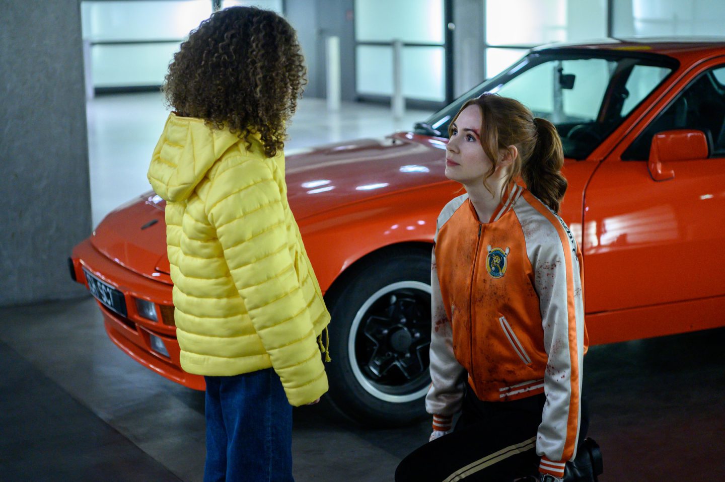 ポルシェ爆走カー・チェイス場面の舞台となるのは、組織ご用達の病院の地下駐車場。真っ赤なポルシェのハンドルを握るのは……なんと8歳と9ヵ月の少女エミリー(クロエ・コールマン)だ。エミリーは、殺し屋たちの策略により筋弛緩剤を打たれ、両手が不能になったサム(カレン・ギラン)の膝の上に座り、ハンドルとギアを担当。アクセルとブレーキを操るサムとのまさかの“操り人形状態運転”で、殺し屋たちの猛追を見事に交わしていく。