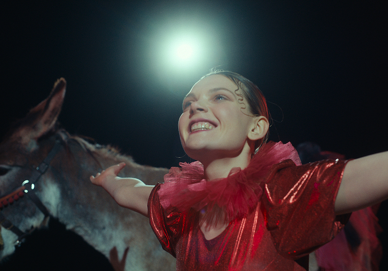 オープニングから、EOと息の合った鮮烈なパフォーマンスを見せるカサンドラ役のサンドラ・ジマルスカの主なパートナーはロバ。「撮影は魔法のような経験で、教訓もたくさんありました。いつも彼らのそばにいて、恐れを克服し、完全に信頼し合えるようになるまで関係を築くよう努力しました。映画全体が夢のような出来事でした」と語る。