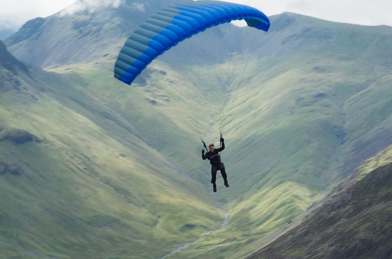 スピードフライングは、小型で高速のスピードグライダーやスカイダイビング用のパラシュートで、パラグライダーのように自らの足でテイクオフし、山肌をなめるように低空を猛スピードで滑空する非常にスリリングなスカイスポーツ。『ミッション:インポッシブル/ローグ・ネイション』(2015)からタッグを組み、公私ともに強い信頼関係を築くクリストファー・マッカリー監督が達観した表情で「トムは限界を知らない」と言うように、世界中のファンが待ち望む最新作で今回もまた生死に関わるレベルのこの激しいスピードフライングを「美しく繊細なスポーツだ」とどこか嬉しそうに表現するトムに対し、マッカリーとスピードフライングのコーディネーター、ジョン・デボアが「非常に危険でもある。スカイダイビングとは似て非なるものだ。スカイダイビングは予測できるが、スピードフライングは違う。小さなパラシュートで山を急降下する。地上すれすれをだ、少しの横風も危険になる」と対照的なほど冷静に説明する。