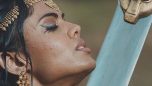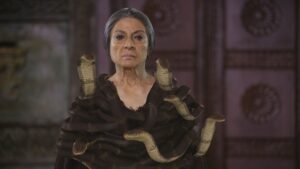 一方、ドラヴィダ人の主人公は王女デヴセナ(カールティカ・ナーイル)で、女王としてこの国を治めていた母親チャームンディが亡くなり、父親に育てられたデヴセナは、王座の後継者と目されていた。ところが、叔母ダヤリニが王座を狙っており、さらにこの国には、ハフマ(タヌージャー)という占い師で王座を守護する老女がいて、国事のすべてはハフマの指示によって決められる。ハフマの年は何と400歳を超えており、身には数匹のコブラをまとうという恐ろしい姿で、凶兆を見極め、命令を降す。
