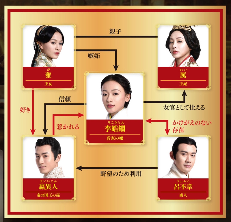 趙の豪族の家に生まれながら、奴隷のような身分に落ちぶれるという境遇。趙王の正室(おば)との確執、呂不韋や子楚との三角関係など、史実の隙間を埋めるような濃密な人間ドラマが展開。趙や秦の後宮をめぐる人々の熱い生きざまには、観る側も感情移入してしまう。