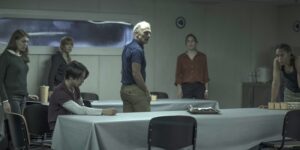 おそらく全6話中の第4話を超えたあたりで、コイツが犯人では? という人物に当たりがつくだろう。それにしても怪しい人間が多すぎて、なかなか確信はできないはず。ここまでの間に、基地内で起こった/起こっていることを登場人物たちと一緒に追体験させられるような状況が作りあげられているため、その構成にまんまと翻弄されてしまうのだ。