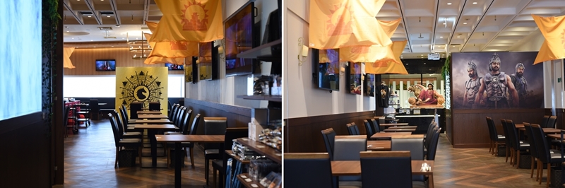 大充実のエントランスをくぐりぬけてマヒシュマティに入国(レストランに入店)すれば、気分はもう民。しかも王国のコース料理が振る舞われる、選ばれし民だ。王の暮らす宮殿に招かれたと妄想すれば厳かな気分になるし、店内のモニターでは『バーフバリ』の名シーンが映し出されているので、王のご活躍を称えながらの歓談も弾む。
