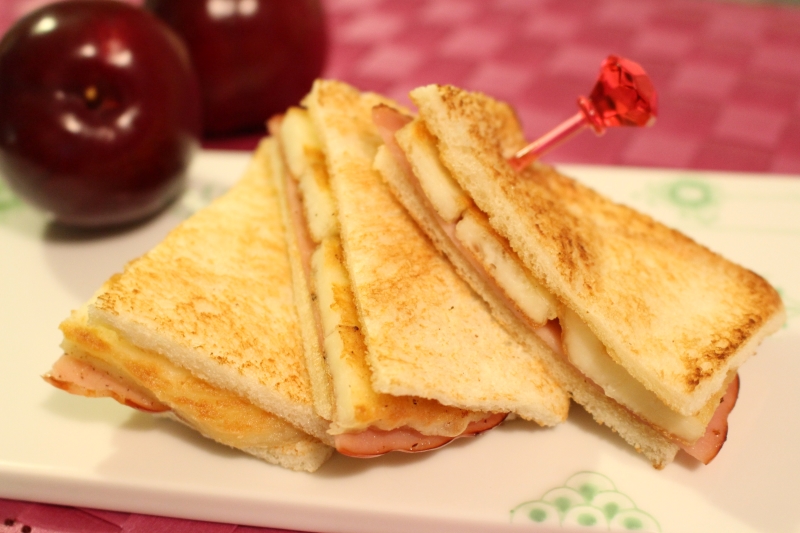 - ①のパンに、ハムと③のチーズを挟み、食べやすい大きさに切ります。チーズが熱々で香り高いうちに召し上がって下さい。