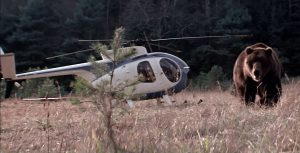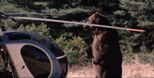 まず『ジョーズ』は機械仕掛けの作りもののサメを使って撮影されていた。いっぽう本作に登場する人喰い熊を演じるのは、本物の熊! もちろん大がかりな仕掛けを作る予算がないから本物を使うしかなかったのだが、「本物の熊が出演!」という危険性は立派な宣伝材料となる。公開当時は「出演者とスタッフの計32名には960万ドルもの生命保険がかけられた」と伝えられた。真偽のほどは不明だが、デキる人間の仕事というのはこういうことだと思い知らされる。