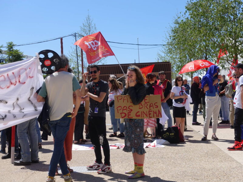 また、映画祭も多くの末端労働者に支えられている。そこで、この状況に対して映画祭のレッドカーペット前でシュプレヒコールがあげられたり、デモが行われたりした。映画祭の音楽・録音関係を担当する<ラジオ・フランス>もストライキを決行。記者会見の録音/データのアップをボイコット。おかげで二日分の記者会見データが録音できなかった。