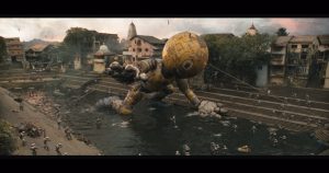 ストーレンハーグ作品といえば『ザ・ループ TALES FROM THE LOOP』がドラマ化されているが、今回も巨大なロボット(やハリボテ)、荒涼とした地平を進む車など彼の世界観が炸裂。やはり彼の“らしさ”はメカメカしたビジュアルだけでなく、自然(景観)と機械が6:4くらいの割合のシーンで強く効果を発揮する。