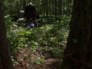 本作の大きな特徴は、POV(殺人鬼の視点)で物語が進行するというユニークな構成だ。冒頭から、おそらくゾンビ的な存在であろう殺人鬼ジョニーの視点で物語が進み、観客は静かに森を歩く彼の背後をついていくような感覚で、その合間にターゲット観察や殺戮の瞬間を目撃することになる。