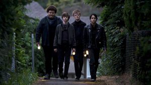 <RKSS>は80’s風の設定を拝借しただけではなく、当時の空気をまとったスリラーを本気で現代に蘇らせようとしている。タイアップした既存曲ではなくシンセサウンド中心のオリジナル楽曲を全編に散りばめ、『グーニーズ』(1985年)や『スタンド・バイ・ミー』(1986年)などからインスパイアされ……と言いたいところだが、もはやテンプレ化した設定なので、ネタ元をほじくり返してもあまり意味はない。