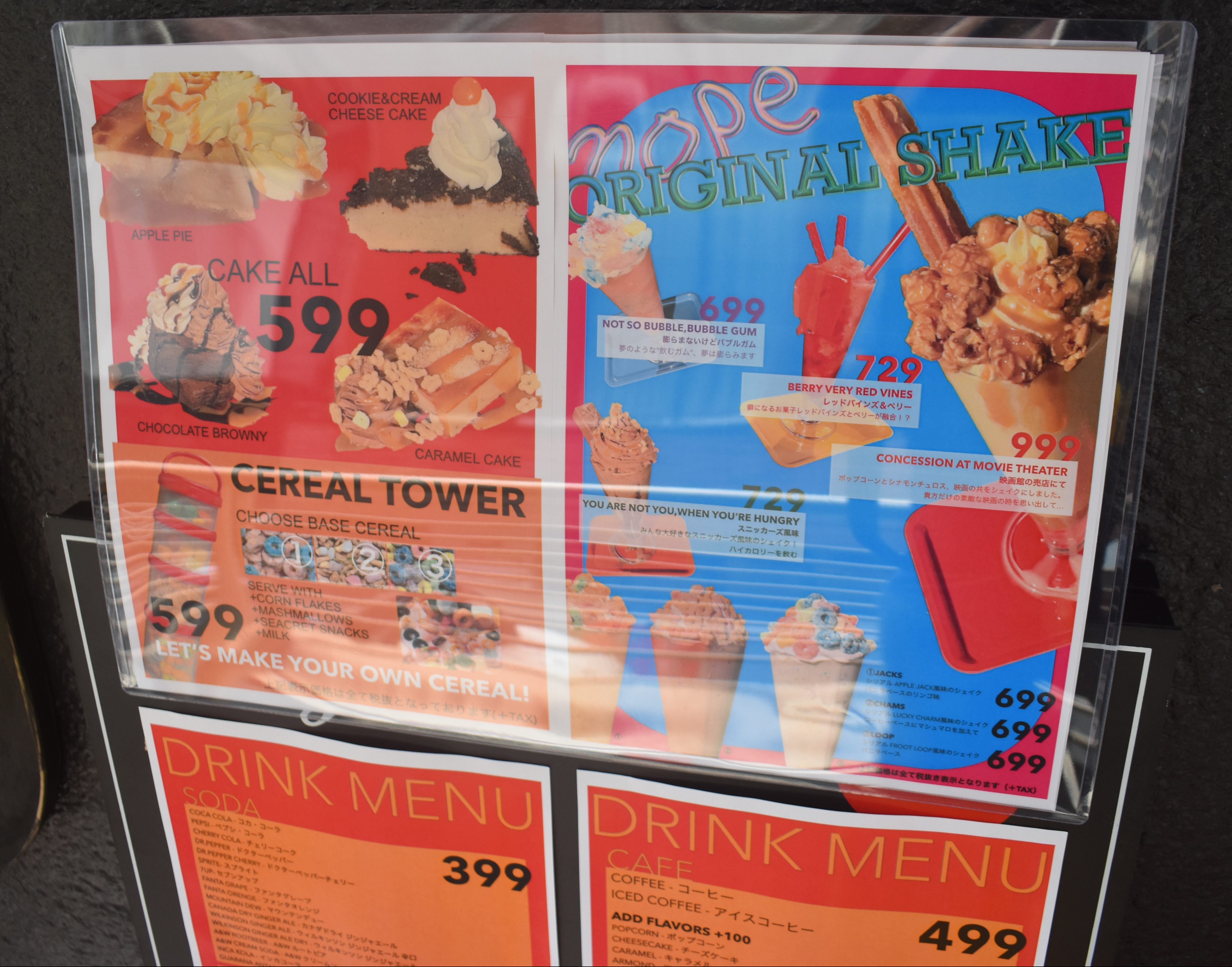 あとは、アメリカのダイナーの定番であるミルクシェイクにも力を入れていて、おもちゃっぽくデコレーションした可愛いシェイクを提供しています。変わったものでいうと、バブルガム味のシェイクやソーダもあります。デザートは、アメリカンな“カロリーお化け”ケーキを提供しています(笑)