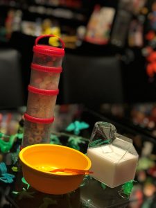 それと朝食やおやつにおすすめなのが、「シリアルタワー」です。シリアルを縦型のタワーコンテナに入れて、牛乳を牛乳パック型のガラスの器に入れてお出ししています。コンテナには2種類のシリアルとトッピング用にマシュマロやチョコレートなどが入っています。