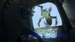 そんなこんなでアルマダ・ロボットは出動するが、怪獣の強さというより、深刻な問題を先送りにしがちな組織体制のあおりを受けて、現場のロボットは、それはもうボロッボロに敗北する。主人公が、「(ロボット開発に関わって)何年もプログラミングに費やしたのに、今は使えないコードに書き換えられてる……」と悲痛に嘆く台詞が、ここまで真剣味を帯びて響くロボット映画も、そうあるものではないだろう。