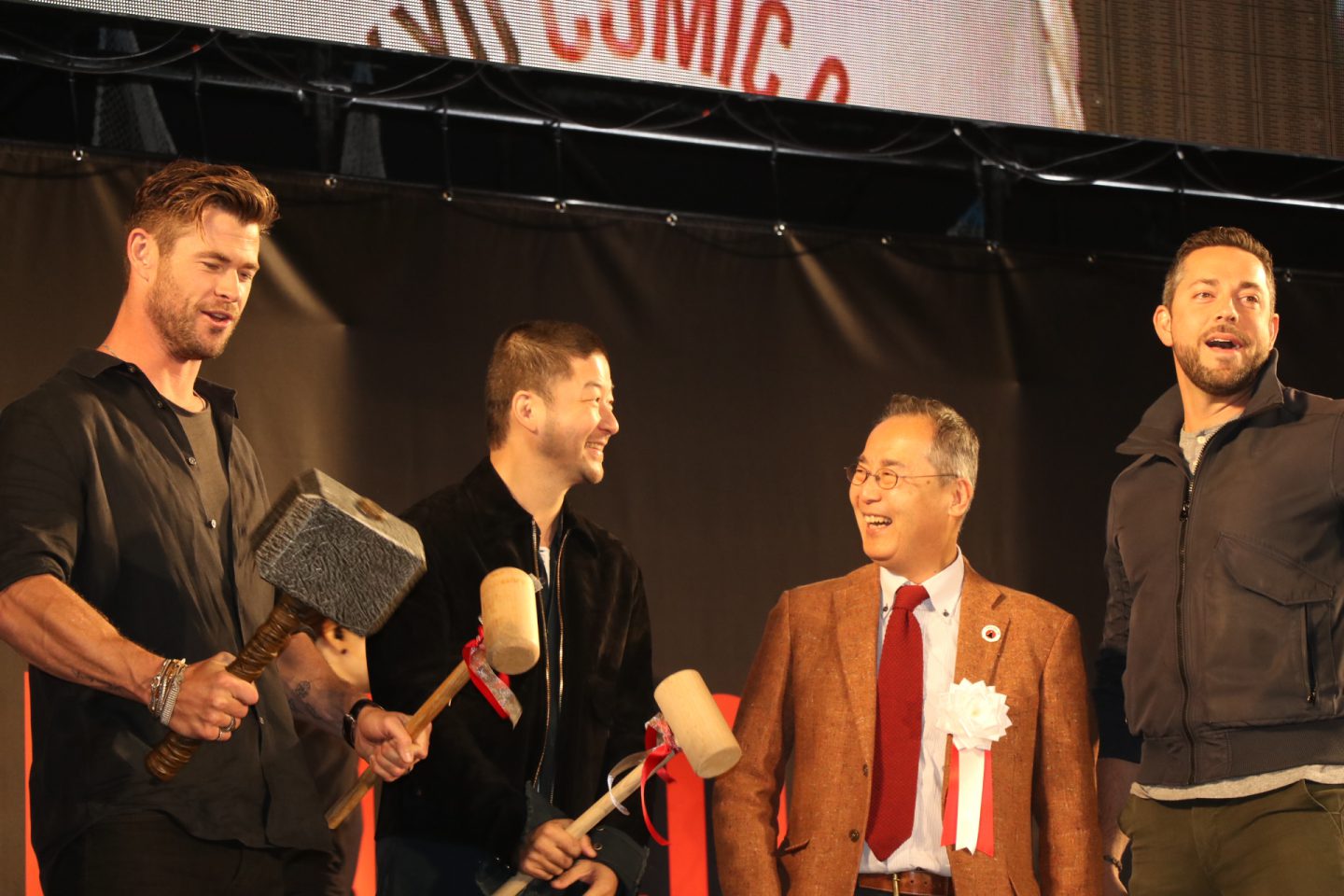 恒例の鏡割りの場面では、クリヘムに木槌ではなくお約束のムジョルニアが手渡され、もうひと盛り上がり。例年以上に多彩かつ豪華なゲスト陣が「東京コミコン2019」の開催を祝した、大興奮のオープニングセレモニーの幕を閉じた。