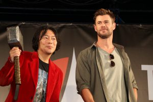 楽屋裏で「ソーのコスプレーヤーの方のためにお手本を見せて欲しい」とリクエストしたら、「スパイダーマンのクモの巣発射ポーズほどマネしやすくないんでどうかな」と笑っていたんですが、しっかりやってくれました。