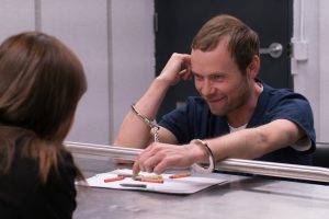 迅速かつドローンを駆使したハイテクな捜査を行い、デカい屋敷の地下でパンイチで踊っていた容疑者はあっけなく御用。しかし、その容疑者が精神を病んだ風の男だったものだから、お話は面倒な方向に進んでいく。ブレンダン・フレッチャー演じるサイコなシリアルキラー(と思われる)サイモンは、サスペンス映画史上トップクラスにイラつく男! ワケの分からないことをつぶやいたり幼児のように泣き叫んでばかりのくせに、地下室には殺傷度の高い罠を仕掛けたりするスキルがあるという、謎が多すぎるキャラだ。