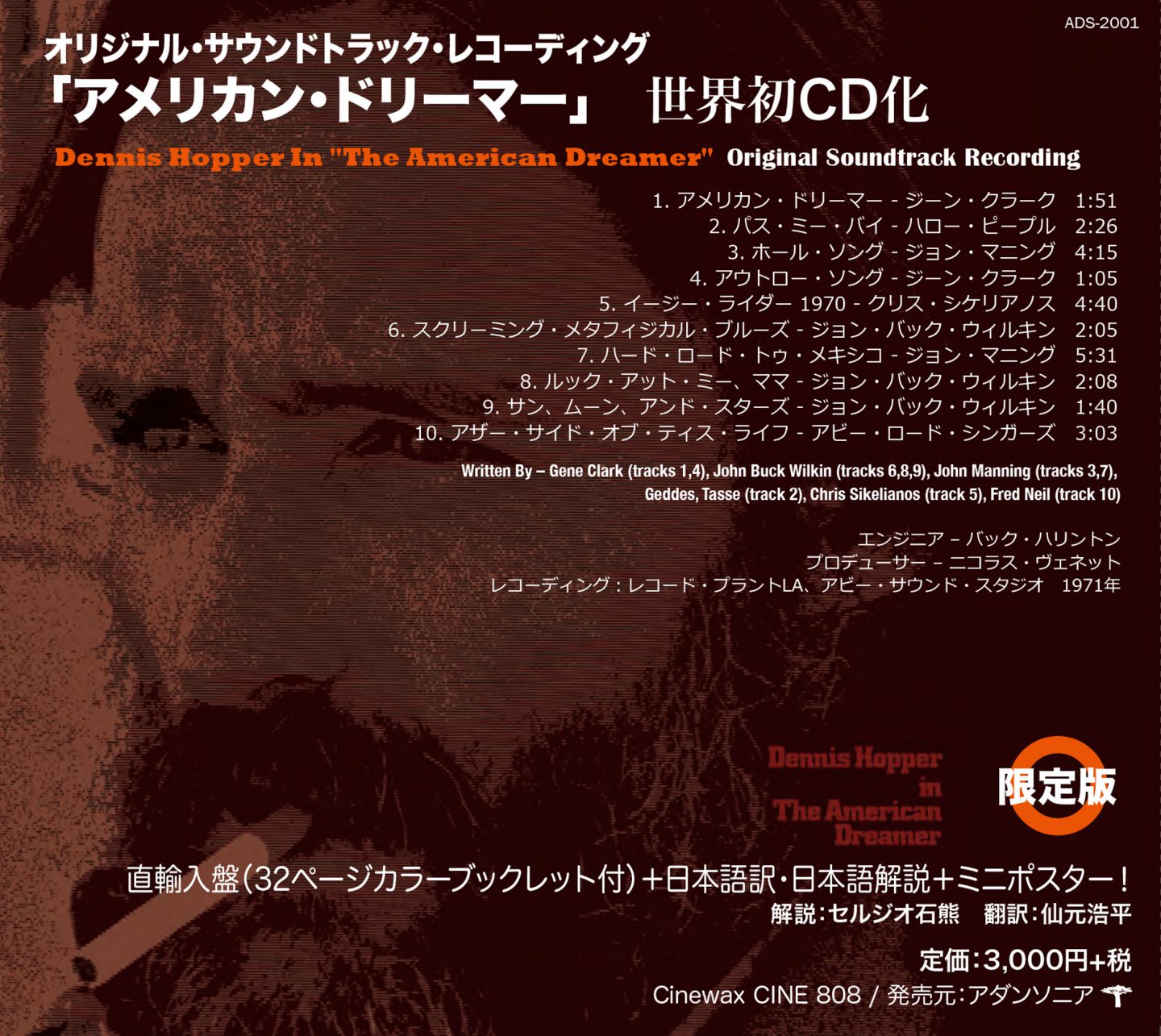 一方で『アメリカン・ドリーマー』のサントラ盤(オリジナル・サウンドトラック・レコーディング)はジーン・クラーク、ジョン・バック・ウィルキン(『ラストムービー』にも出演)らの歌を収録して発売され、音楽ファンの間では名盤としてコレクターズアイテム化。銃とタバコを手にしたホッパーをシラーが撮影したポスターが付録についていた。このサントラに曲を提供したシンガーソングライターのジョン・マニングのソロアルバム「ホワイト・ベア」のジャケット写真には、『アメリカン・ドリーマー』のポスターが貼られた部屋が映っている(『アメリカン・ドリーマー』でホッパーがホワイト・ベア=白熊のことを話していたのも意味深だ)。