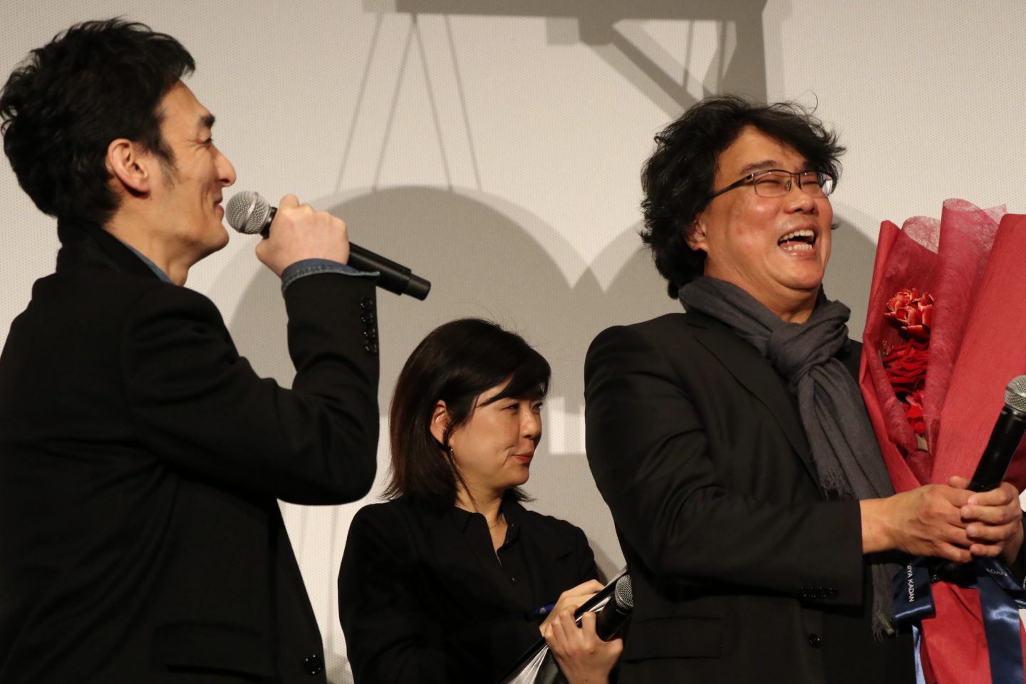 パラサイトのオープニングテーマと盛大な拍手に包まれて登場したポン・ジュノ監督は「まずはこのように劇場を一杯にしてくれて、本当にありがとうございます。アカデミー賞を獲る前から日本のみなさんが劇場に来てくれていたことに、心から感謝しています。日本のお客さんはお目が高いですね(笑)」とユーモアを交えつつコメント。ソン・ガンホも「本当にありがとうございます。言葉が違うのに共感できるのは映画の力。みなさんはそれを見せてくれました。感動しています」と続いた。