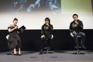 大きな拍手で迎えられた森川と三上は、おそろいの黒いパーカーを着て登場。「新手のユニットです(笑)」とおどける森川を、にこやかに見守る三上。作中に登場する黒騎士(連続猟奇殺人事件の容疑者)をイメージして作られたムービープラス製のオリジナルパーカーは、胸にロシア語で“ゴーゴリ”と記され、腕を上げると黒騎士の角を思わせるデザインが施されている。「これ、普段も着れますね」「(ロシア語で書いてあるから)読めないし。英語だと恥ずかしかったりしますからね」と、二人も気に入った様子だ。