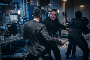 本作のマ・ドンソクが演じるのは、腕っ節自慢のヤクザの組長ドンス。名前からして強そう……。初登場シーンでは、サンドバックを黙々とぶっ叩いているのだが、そのサンドバックを開けると中には人間が詰め込まれていました! というブルータルなサプライズで先制。