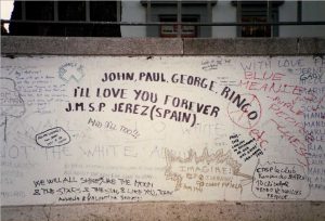 まず4人であの横断歩道を歩いて、写真を撮る。そういう団体が順番待ち。あの横断歩道では歩行者が待っていると絶対に車は停止しなければならないという厳しいルールがあるので、必ず渋滞が起こる。気持ちはわかるが住んでいる人間にはちょっと鬱陶しい。それからスタジオの壁に「アイシテル」「4ニンヨエイエンニ」「〇〇〇ケンザン」とか書いても世の中変わらない、誰も読みはしない、誰の役にも立たないことを落書きしていく。みんなマジックペンを持参しているのがちょっと感動的かも。