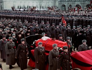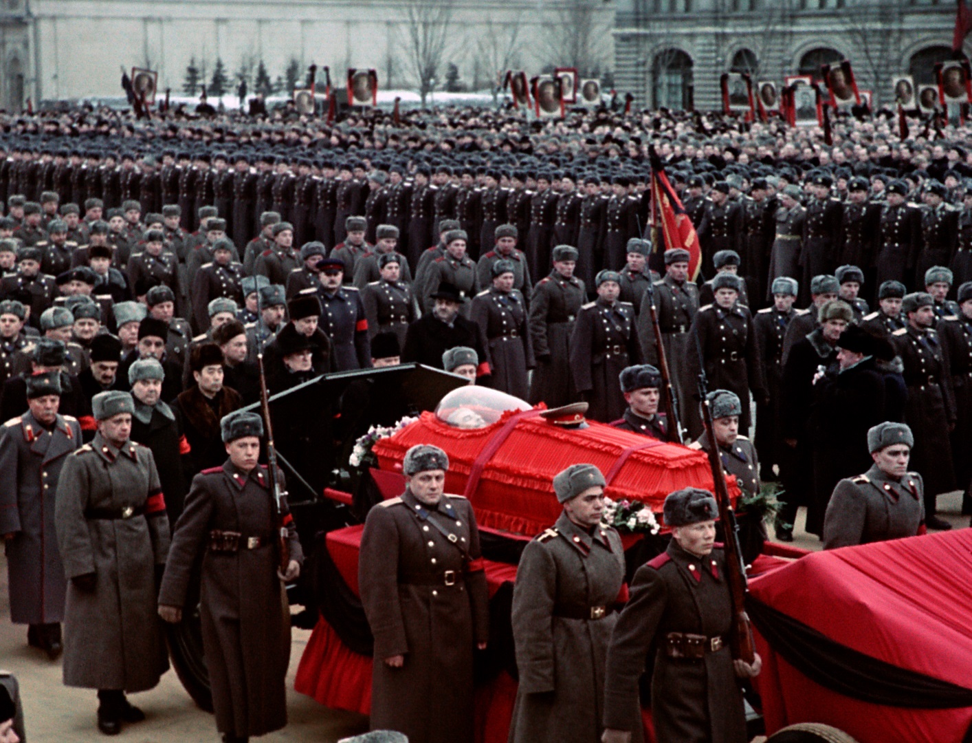 『国葬』は1953年3月5日に死んだスターリンの葬儀の記録だ。当時200名近いカメラマンがソ連邦の津々浦々に派遣されて撮った追悼行事と、各国の要人が弔問に訪れて行われたモスクワでの盛大な国葬の模様が克明に記録されている。おそらくは史上最大規模であろう大国の指導者の国葬は、何もかもが桁外れで、笑いを誘うほど大げさである。そして、葬儀後に起こる血で血を洗う権力闘争(弔辞を読んだ最高権力者3名はいずれも失脚、ベリヤは同年末に処刑)を知った目で見ると、歴史の非情さを思わずにはいられない。