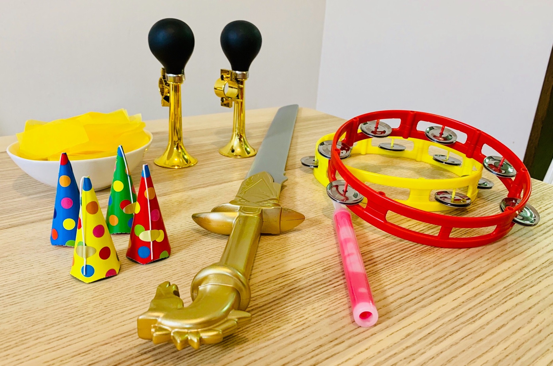 コレがなきゃダメ!ということは無いのですが、絶叫上映の定番でいうと、タンバリン、クラッカー、サイリウム・ペンライト。それからマサラ上映では紙吹雪があると楽しいです。いずれも100円ショップで買えます。鳴り物は、劇場だとタンバリンと鈴のみを使用可ということが多いのですが、手に入るならバーフバリが吹くチャルメララッパ(?)とかも楽しいかもしれないですよね。個人的には、ターメリックを散布する方がいるとすごいな、と思っていますが(笑)。さすがにおうちとはいえ、掃除が大変なんでムリですかね。