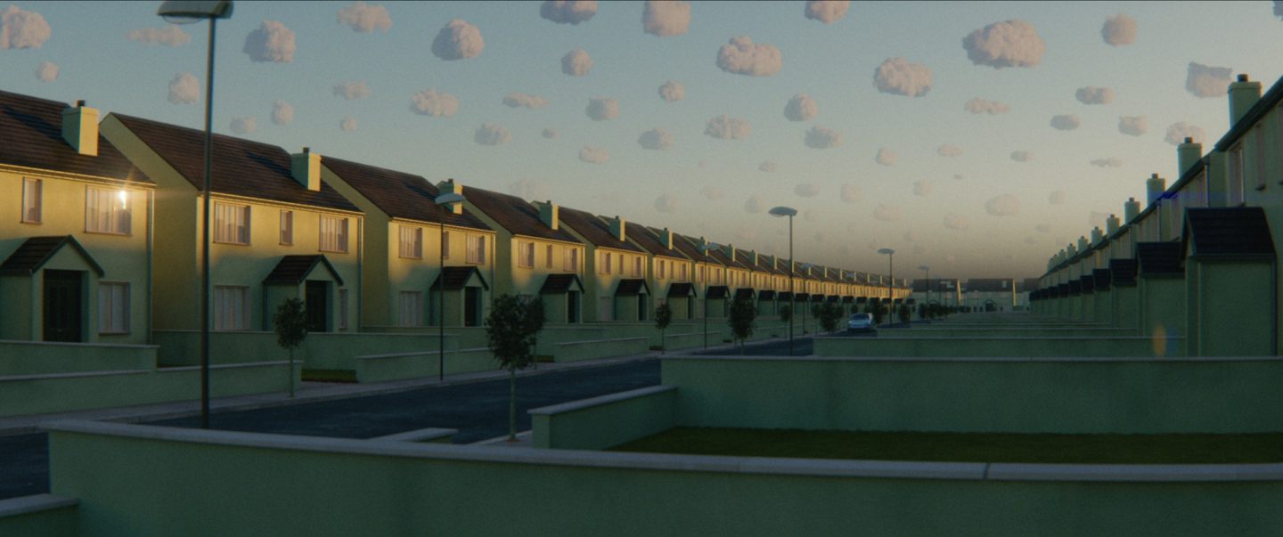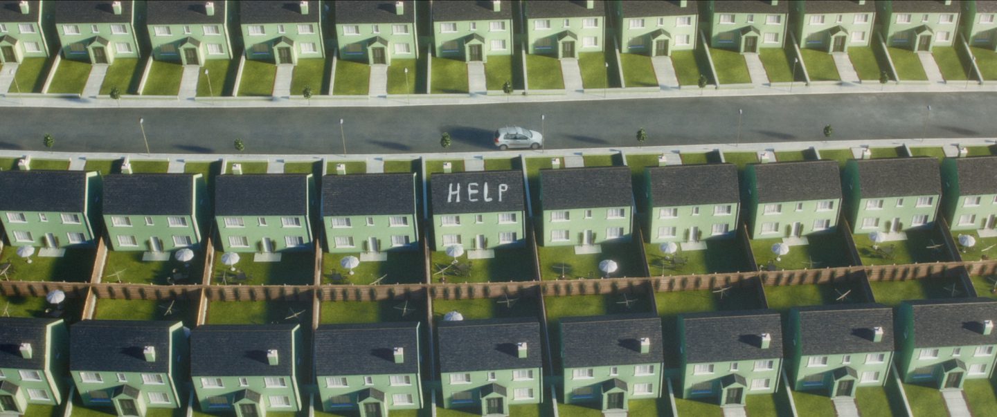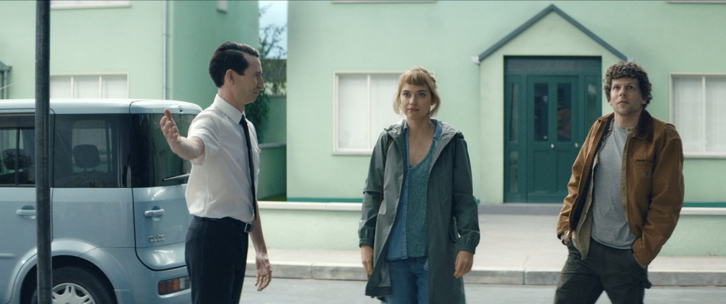 そして、巣から落とされ死んでしまったヒナを丁寧に埋めて合掌するのは、ジェマ(イモージェン・プーツ)とトム(ジェシー・アイゼンバーグ)の仲良しカップル。ふたりはハッピームード満点で新居探しのためにぶらりと不動産屋へ行くが、奇っ怪な不動産営業担当者マーティン(ジョナサン・アリス)のススメであれよあれよという間に郊外にある新興住宅地ヨンダーへ。着くとそこは同じような色、同じような構造の一軒家が画一的にずらーっと並ぶ、なんとも平面的な不思議地域だった。