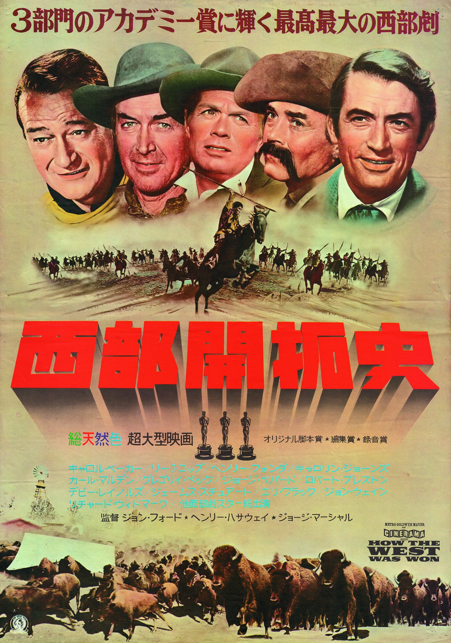当時、まだ東京と大阪に2館しかなかった「シネラマ」専用劇場(映写機を3台横に並べて上映した)で公開されたシネラマ西部劇『西部開拓史』だが、地方劇場や一般映画館用に「非シネラマ」版も作らねばならず、タイトルロゴだけでも3種類あったという。いわゆる「ベン・ハー文字」と言われる、立体的でとび出してくるようなロゴが期待されたが、まだ未消化となっている様子がうかがえる。