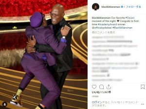 『ブラック・クランズマン』の文字が見えた瞬間に嬉しくなってたまらなかったのか、サミュエルは満面の笑みで受賞者の名前と作品名を絶叫!監督のスパイク・リーも、ついに自身の作品で悲願のオスカーを手に入れ、ステージに上がるや否や、サミュエルに飛びつき熱烈なハグを交わした。この二人の仲良しっぷりに、観客も大喝采。
