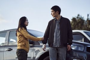 『楽園の夜』にもこれと似たシーンがある。食事中にジェヨンはテグに酒をすすめる。テグは「運転があるから」と断る。「ここは飲酒検問なんてない」と食い下がるジェヨン。次のシーン、テグは公道の検問でアルコール測定器に呼気を吹きかけている。ジェヨンは酔って正体をなくし、警官に激しく絡んでいる。