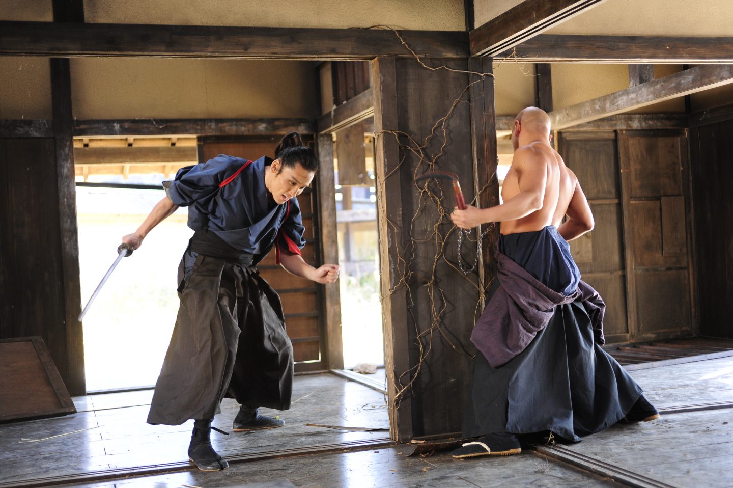 この宮本武蔵を演じているのが、坂口拓さん。この方の殺陣が本当にすごい! 剣先で相手の太刀を払うやいなや、脳天に一撃! 時には踏み込んできた相手を前蹴りや足を払って倒し、剣を突き刺す。これぞまさしく戦さ場での剣術。グレイシー柔術でお馴染みの日本古来の柔術のルーツは、戦国時代の戦場で、お互い武器がなくなった時の組み手が元なのだが、そんな戦場での戦い方を感じさせてくれる坂口さんの殺陣は見事である。