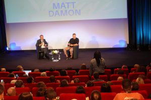 第74回カンヌ映画祭のマスタークラス“Rendezvous avec”に登壇したマット・デイモン(右)/筆者撮影