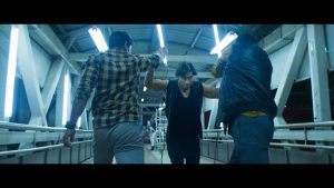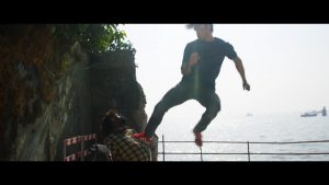 さらに続くジムのシーンでは、タンクトップから溢れんばかりのムッチムチな筋肉が拝めるし、途中からジャングルにワープして、ドーティー(腰布)姿でカラリパヤットゥの形も披露してくれる。赤線の入ったドーティー姿は古武士のような風格さえ漂い、このあたりでファンは急増することだろう。その後も、歩道橋で野良犬をいじめていた男たち相手に立ち回りをし……と、ヴィドゥユトのアクションスターとしてのアピールが続く。