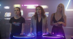 まずレトロアーケードゲーム風のオープニングからして一般的なアサイラム作品らしからぬ凝りようだが、なにより特筆すべきは主人公たちが最初に戦う“一面のボス”についてだろう。謎のゲーム機“ランカラ”の画面を通じて、ゲーム内に広がる別世界に吸い込まれてしまった主人公たち。その異空間で彼女らを待ち受けていた一面のボスは、なんとあの“シャークネード”だったのだ。