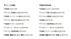 死霊館ユニバースは2013年にジェームズ・ワン監督が発表した『死霊館』を起点としています。“ユニバース”という言葉が示すように、1つの世界観の中で様々な怪奇事件が起こるわけです。公開順/お話の流れの時系列は以下の画像のとおり。