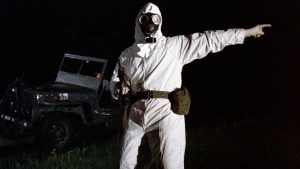 除染服ライクな白い服に身を包んだ部隊は、ガスマスクで顔も見えず台詞もロクになく、不気味の一言である。コミュニケート不能なところが、ゾンビと共通しているかもしれない。何よりも都合の悪い真実であるからと、個々人のささやかな生活が国家の都合で握りつぶされていく……。その非情さに、より焦点が当てられている。