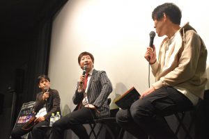 今回のトークイベントに招かれたのは、映画識者たちが忌憚のない意見を交わすことで人気を博している<映画本音でジャッジ 批評トークライブ>から有村昆(写真中央)、松江哲明監督(写真右)、藤井ペイジ(写真左)の3名。上映ラインナップの中でも注目度の高い『孤独なふりした世界で』先行上映後に、ざっくばらんな映画トークを繰り広げた。
