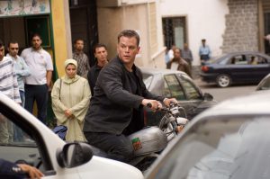 ボーンは、トレッドストーン計画でパリの連絡員を務めていたニッキーを連れ、計画の秘密を知るダニエルズを追ってモロッコのタンジールにやってくる。CIAの命を受けた暗殺者デッシュが二人を追い、三つ巴のチェイスは、途中ダニエルズの爆死で警察が加わり、四つ巴となって、市場の雑踏から屋上へ。そこでボーンは、ニッキーを銃で狙うデッシュを発見し、彼女を救うために窓の中へ飛び込んでいく。