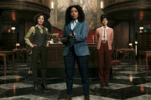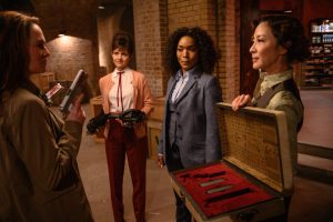 しかも、御三方の衣装が素晴らしい。アンジェラは青系、ミシェルは緑、カーラはピンクの衣装というように、キャラクターごとにカラーがはっきりした衣装をエレガントに着こなしています。そこにオレンジのスカジャンのカレン・ギレン、ブラウンのコートを着たレナ・ヘディたちが合流したことで、スーパー戦隊シリーズのような燃えるチーム感を漂わせてくれます。