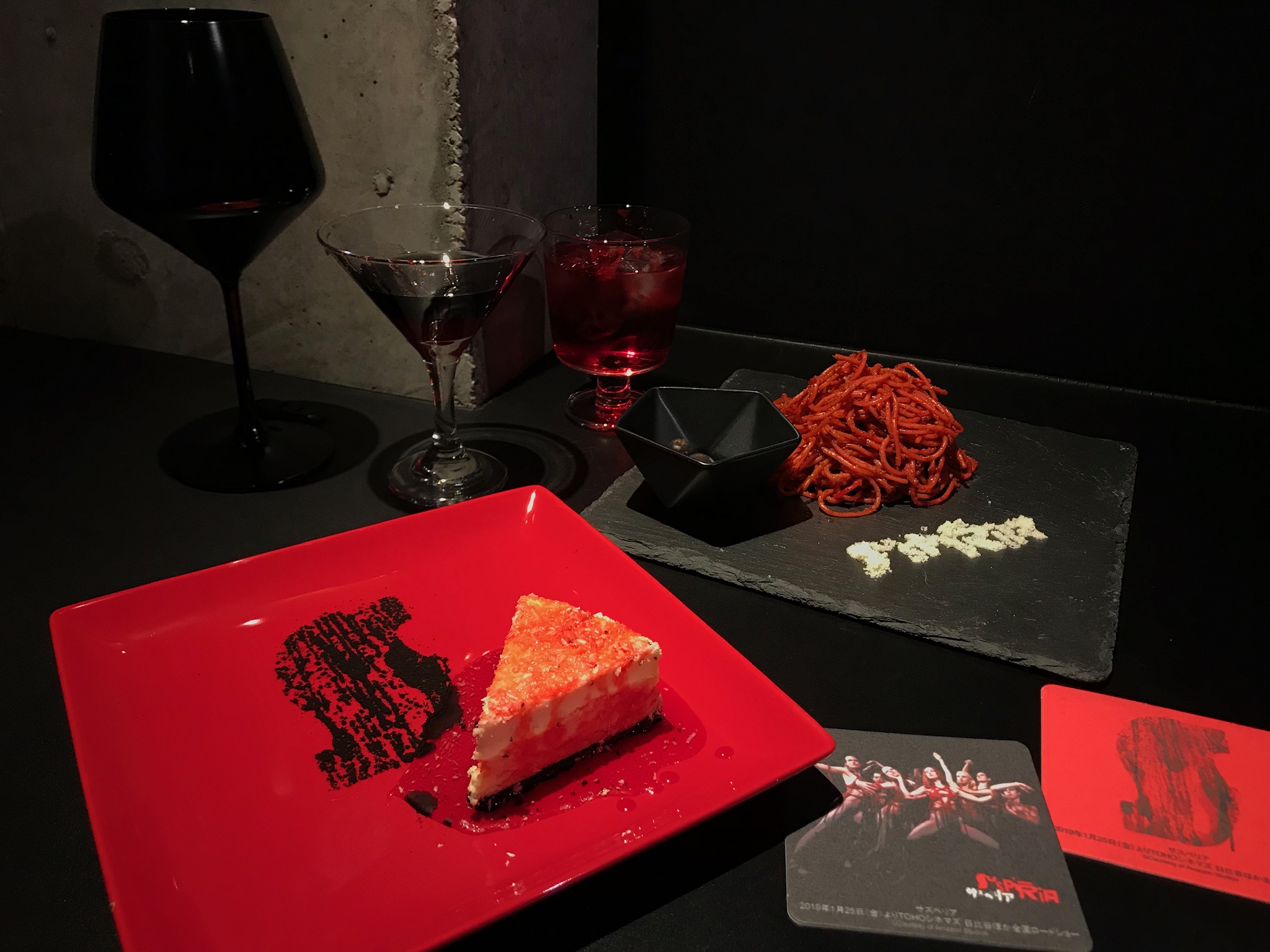 奥様:企画によってメニューも変わるんですが、『サスペリア』は一番お気に入りでした。赤いパスタと赤いカクテル、赤いケーキ……。ケーキは、クセがありますが、ビーツっていう色鮮やかな野菜を使って赤くしました。カクテルはカクテルグラスにストロベリーで血を模して、垂れてるような感じにしたりとか。メニューを作っている私たちは楽しんでやっています(笑)。毎回みんな悩みながら、「これは良いんじゃない?」とかスタッフ皆で意見を出し合ってメニューを考えています。