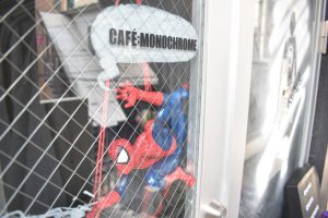 スタッフの私物というスパイダーマンのフィギュアが天井から吊るされている。