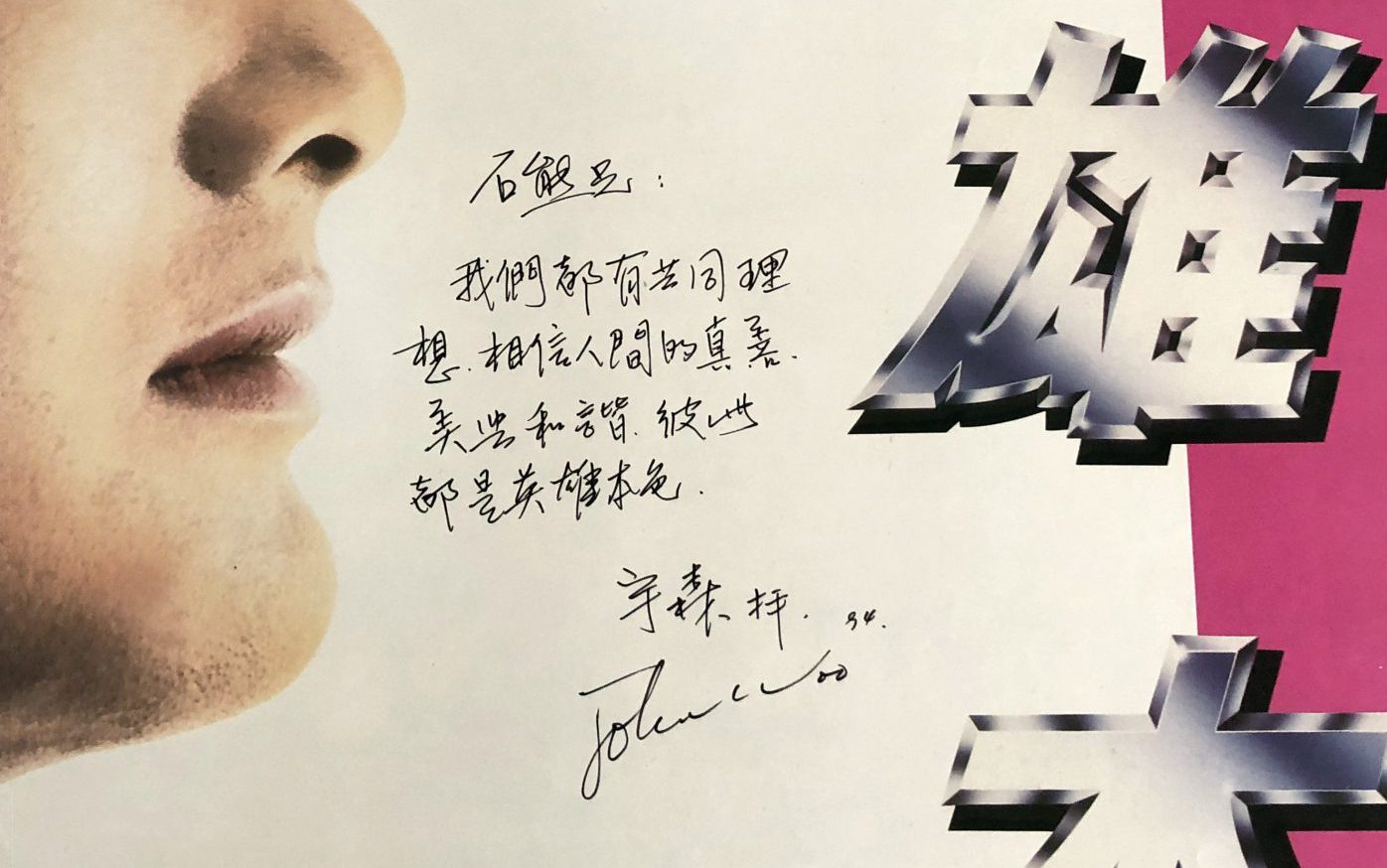 『男たちの挽歌』の監督と脚本を務めたジョン・ウー監督がオリジナル香港版ポスターに書き込んでくれた言葉だ。友人に訳してもらったところ、「共に同じ理想を持ち 真実と善が美しく調和すると信じる男たち それが本当の英雄だ」というような意味だそうだ(もっと漢文の勉強しとけばよかった)。それは、監督の個人的な理想にして、映画そのもので描いたメッセージであり、ポスターが(映画を観る前の)人々に伝えるべきテーマである。